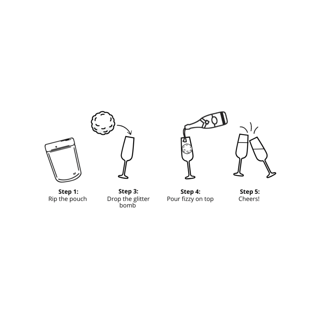 Just rip, drop, pour, and sip for a touch of magic in every bubbly sip! Each bag contains 2 Glitter Bombs filled with edible glitter, ready to dissolve in your favorite beverage and transform it into a whimsical, sweet delight.